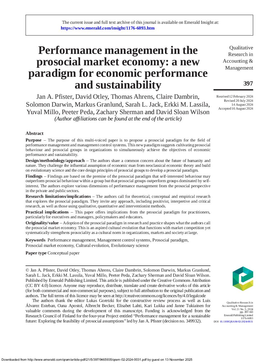 The purpose of this multi-voiced paper is to propose a prosocial paradigm for the field of performance management and management control systems. This new paradigm suggests cultivating prosocial behaviour and prosocial groups in organizations to simultaneously achieve the objectives of economic performance and sustainability.
