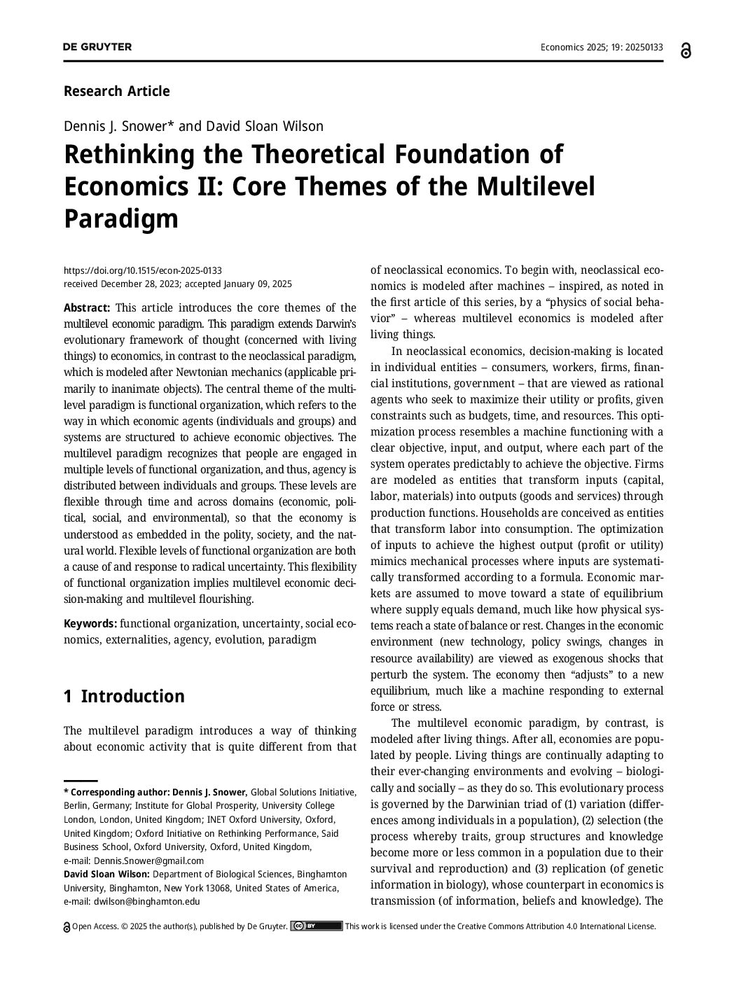 This article introduces the core themes of the multilevel economic paradigm. This paradigm extends Darwin’s evolutionary framework of thought (concerned with living things) to economics, in contrast to the neoclassical paradigm, which is modeled after Newtonian mechanics (applicable primarily to inanimate objects). The central theme of the multilevel paradigm is functional organization, which refers to the way in which economic agents (individuals and groups) and systems are structured to achieve economic objectives. The multilevel paradigm recognizes that people are engaged in multiple levels of functional organization, and thus, agency is distributed between individuals and groups. These levels are flexible through time and across domains (economic, political, social, and environmental), so that the economy is understood as embedded in the polity, society, and the natural world. Flexible levels of functional organization are both a cause of and response to radical uncertainty. This flexibility of functional organization implies multilevel economic decision-making and multilevel flourishing.
